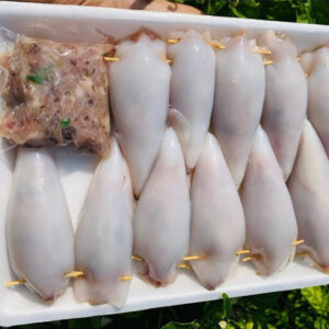 Hướng dẫn chế biến: Hấp chín 15 phút hoặc chiên/nướng vàng giòn.Mực tươi được làm sạch kỹ lưỡng, nhồi bên trong nhân thịt heo xay nhuyễn, trộn cùng hành, tiêu và các gia vị vừa ăn, tạo nên hương vị đậm đà, thơm ngon. Sản phẩm được đóng gói hút chân không và bảo quản lạnh để giữ nguyên độ tươi, ngọt tự nhiên của mực và thịt, đảm bảo khi chế biến vẫn giữ được chất lượng tốt nhất.