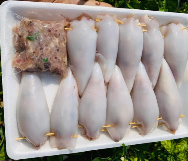 Mực vùng biển tươi được làm sạch, nhồi thịt heo tươi xay nhuyễn, nêm nếm vừa ăn. Đóng gói hút chân không, bảo quản lạnh để giữ độ tươi ngon.