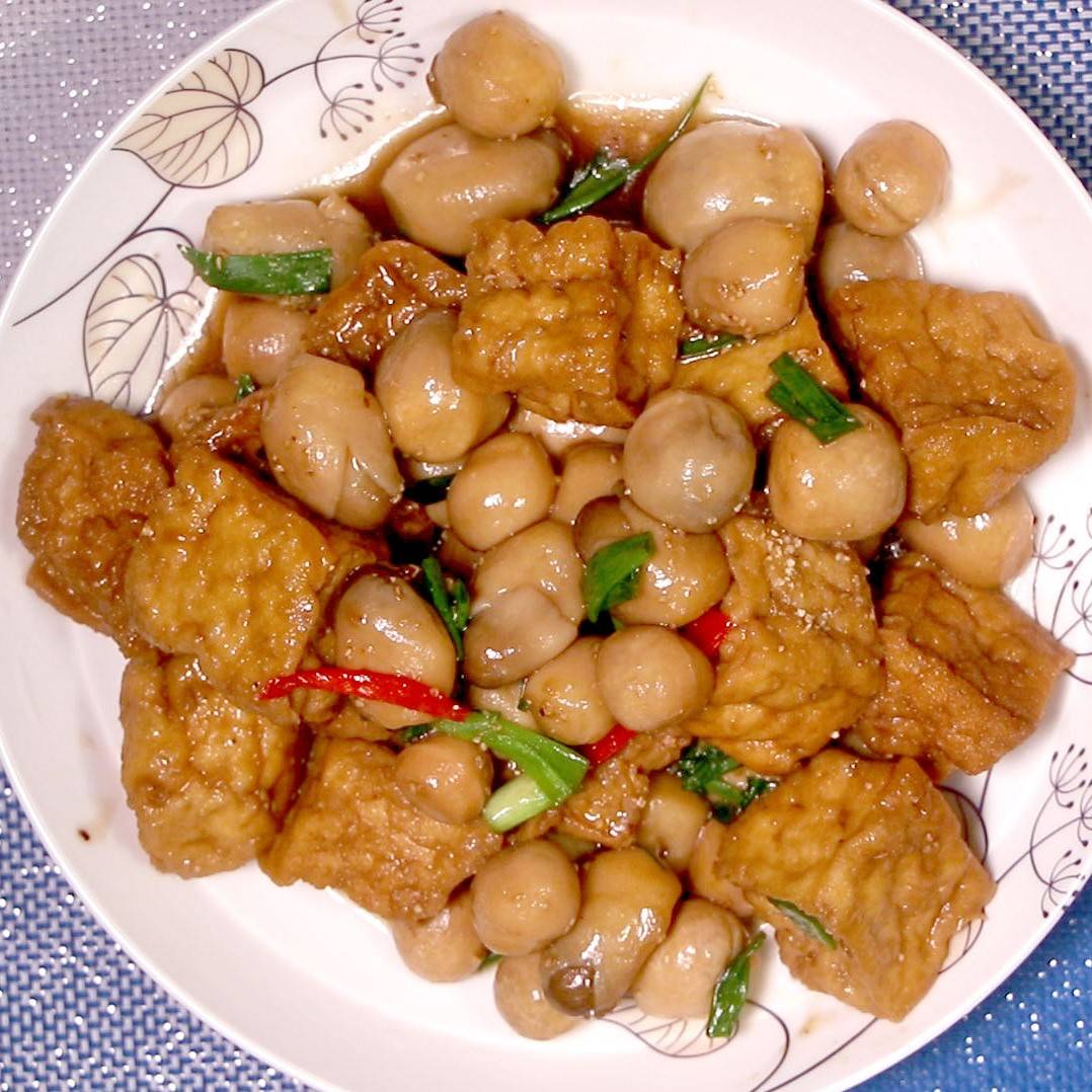Nấm kho đậu hũ là món chay thanh đạm mà đậm đà hương vị. Đậu hũ được chiên vàng rồi kho cùng các loại nấm tươi như nấm rơm, nấm đông cô… trong nước sốt đậm vị từ nước tương, hành, tỏi và chút tiêu. Khi chín, nấm mềm ngọt tự nhiên hòa quyện với đậu hũ béo bùi, tạo nên món ăn giản dị nhưng rất bắt cơm.