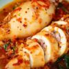Mực nhồi thịt là món ăn tinh tế với những con mực tươi ngon được làm sạch, nhồi đầy nhân thịt băm trộn cùng nấm, miến, hành và gia vị. Sau đó mực được hấp hoặc chiên, kho rim cho thấm đều, tạo nên hương vị ngọt giòn của mực quyện cùng vị béo bùi, đậm đà của nhân thịt, ăn rất bắt cơm và không hề ngán.